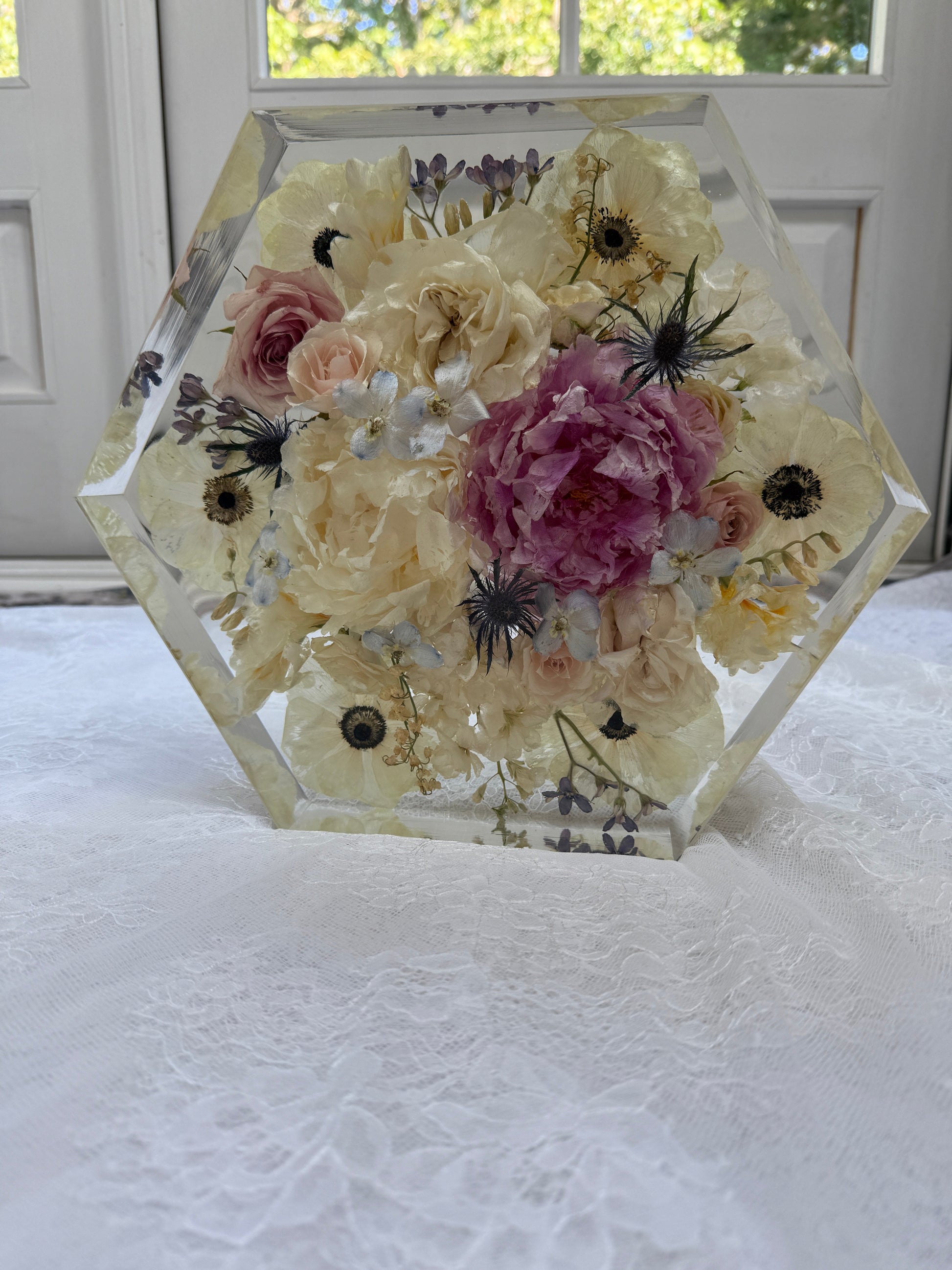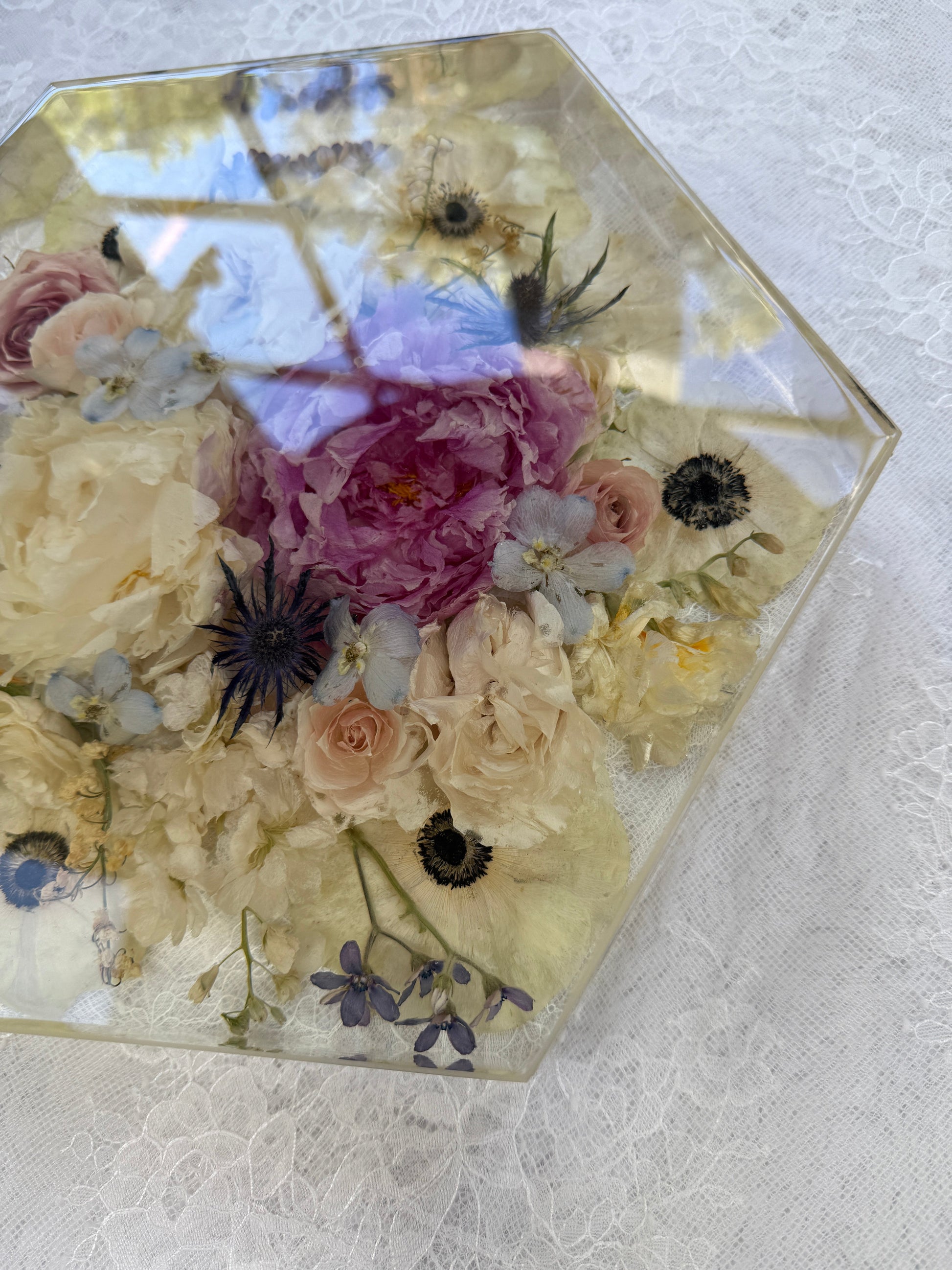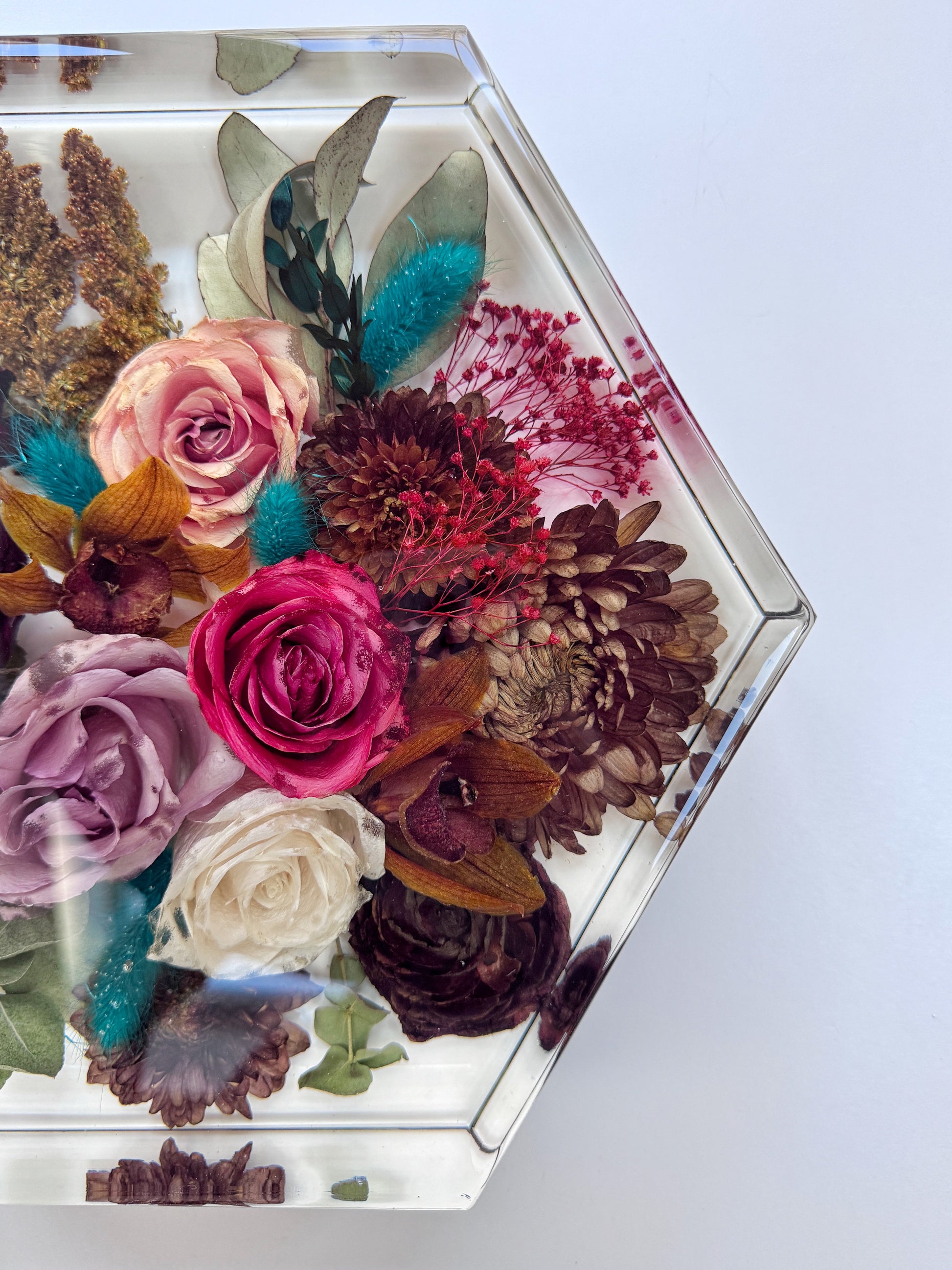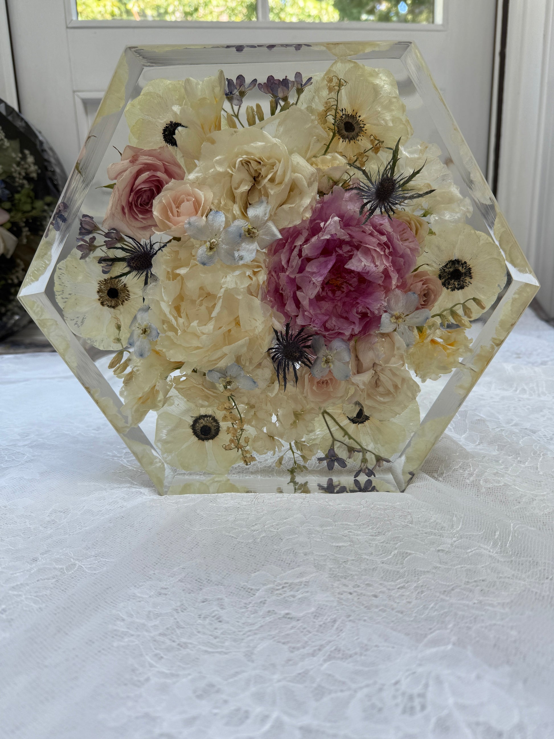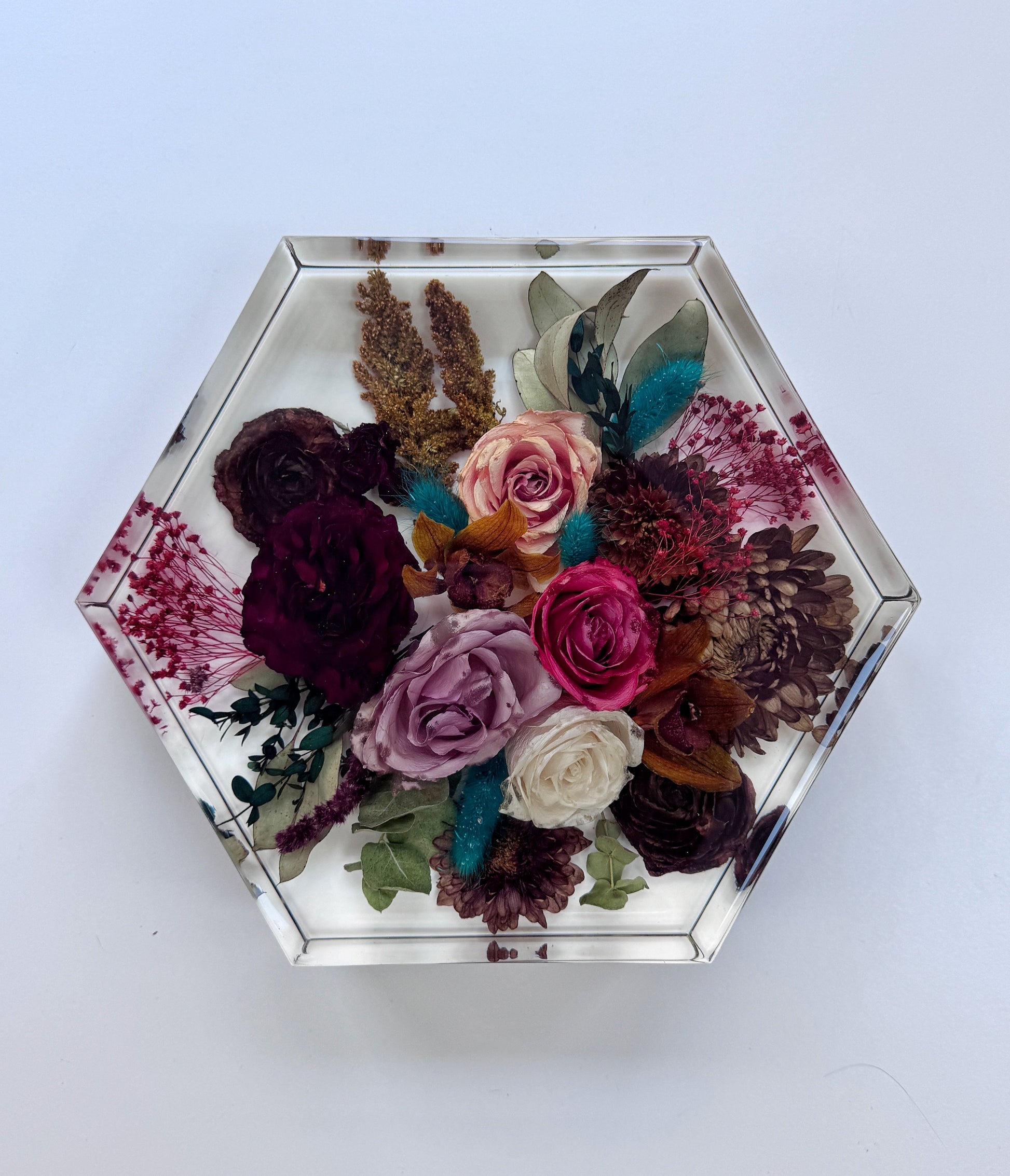 This hexagon display piece is a modern and elegant way to preserve your cherished flowers. showcasing them in a timeless geometric design.