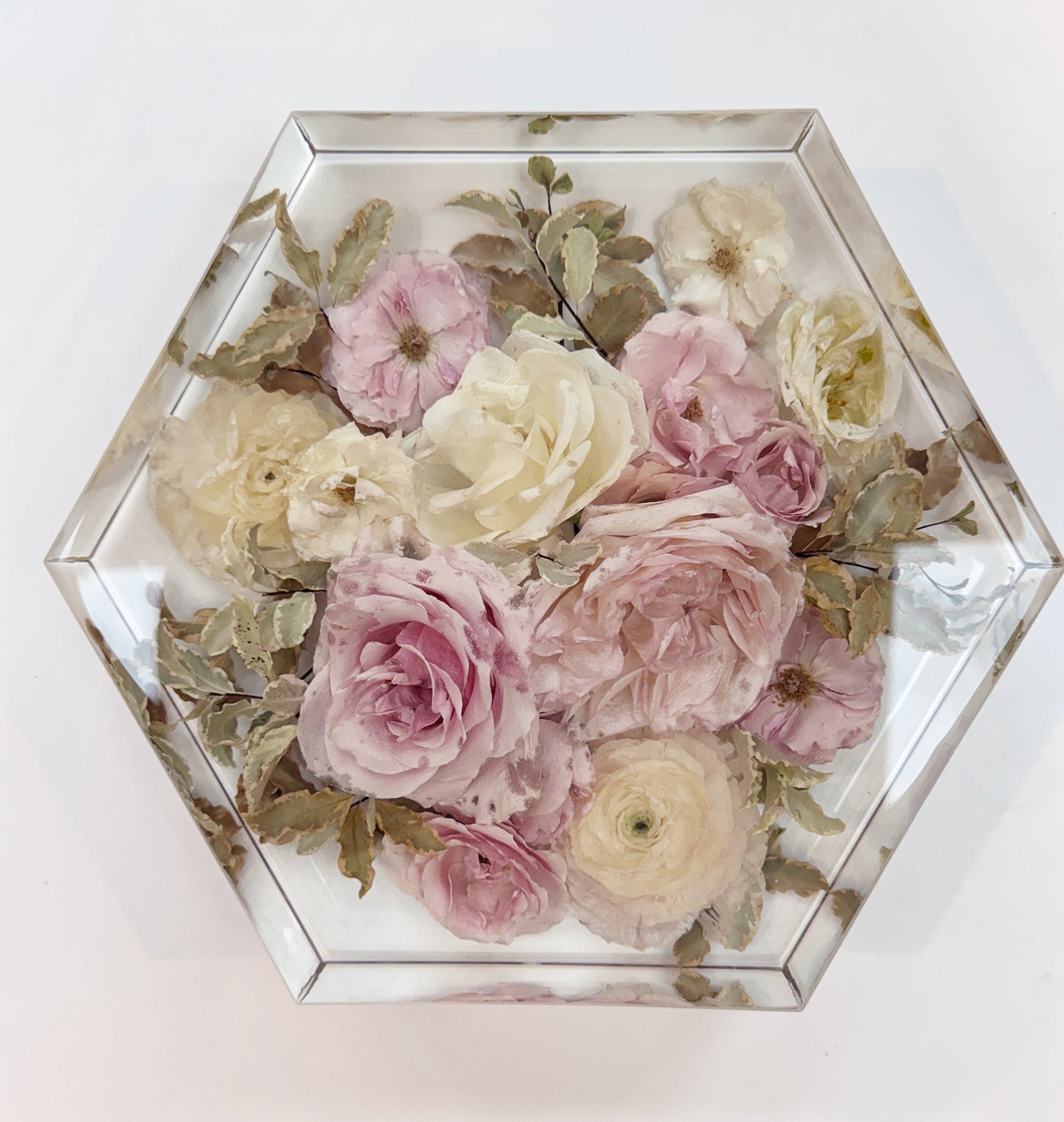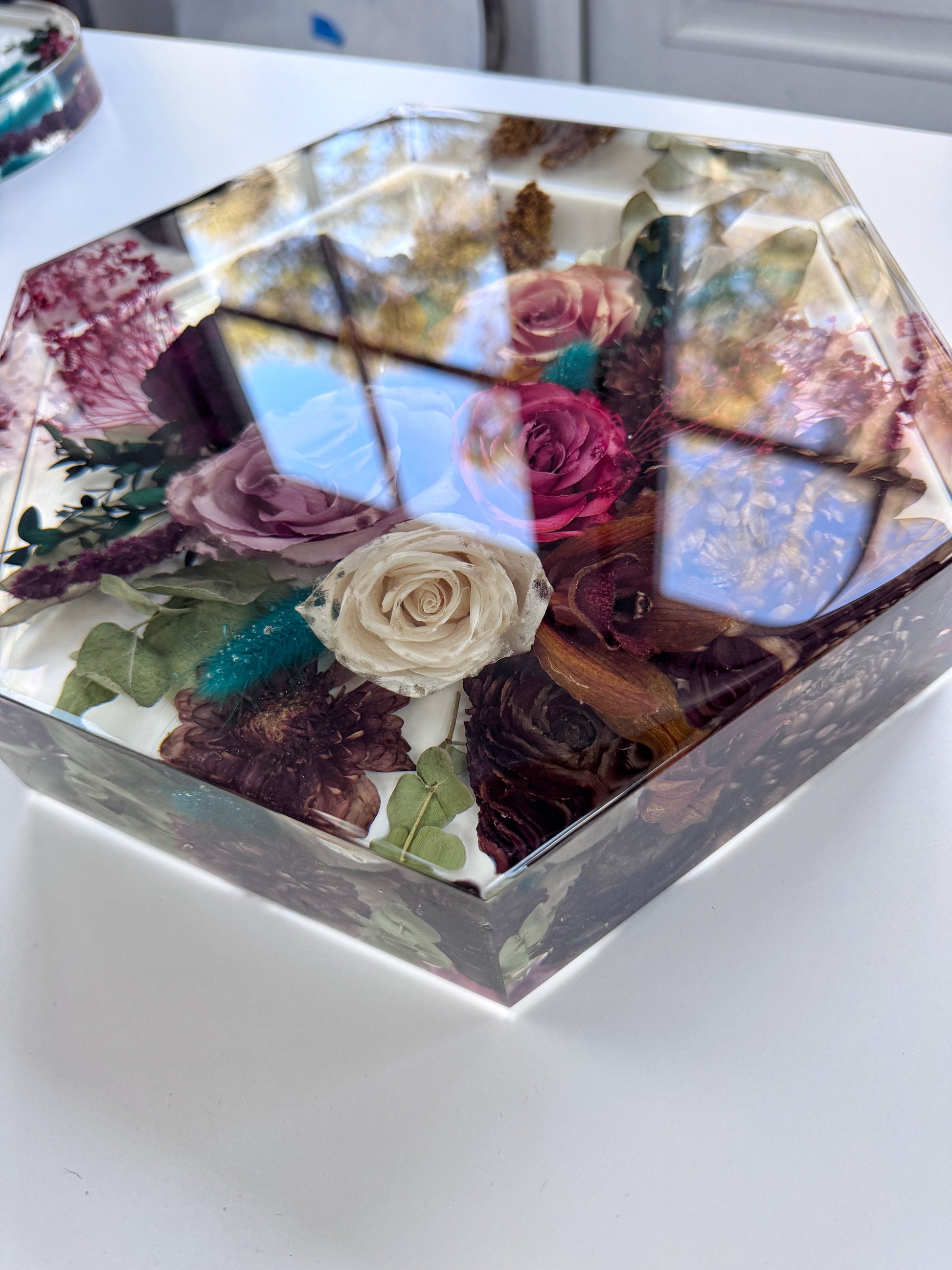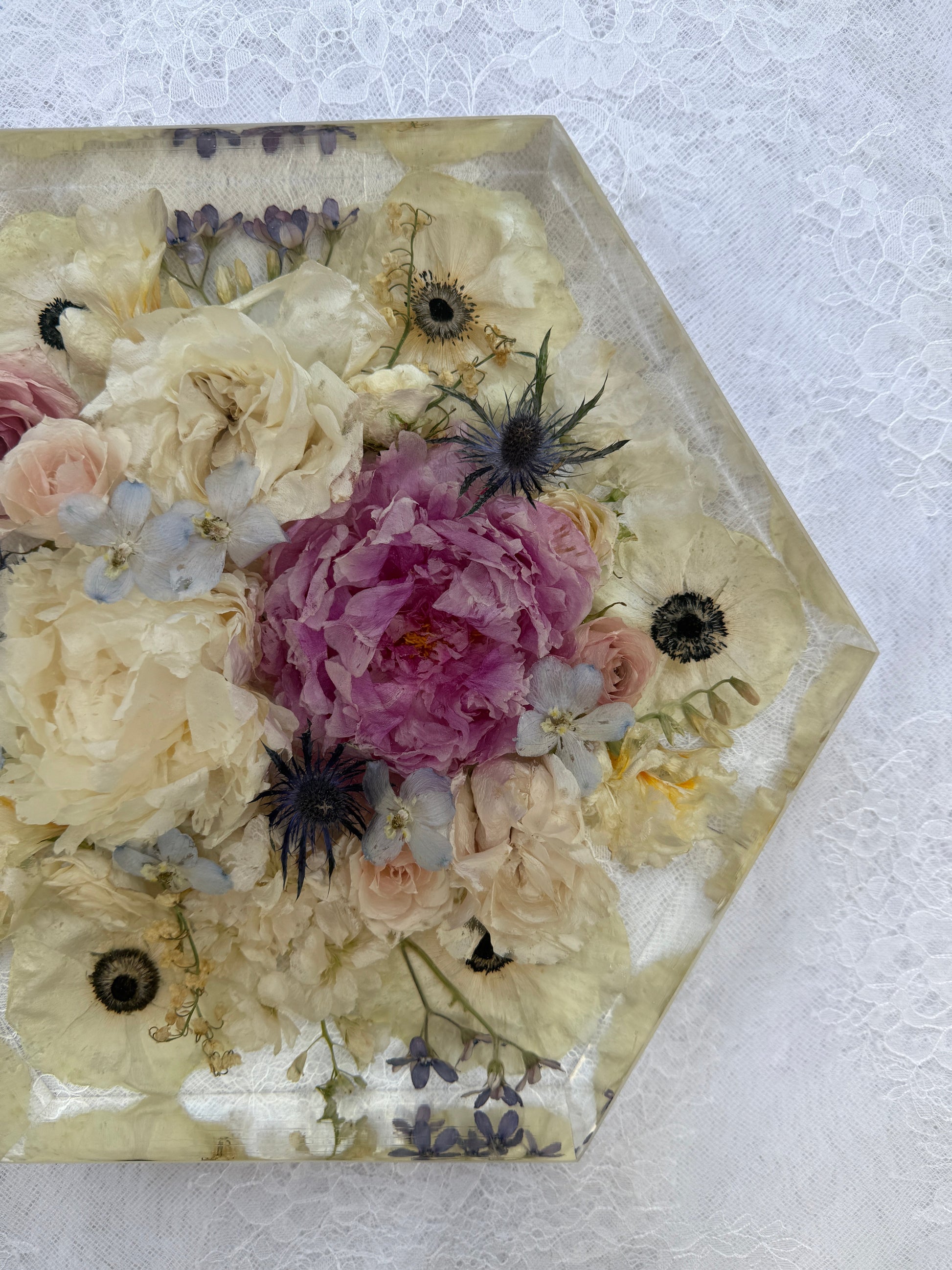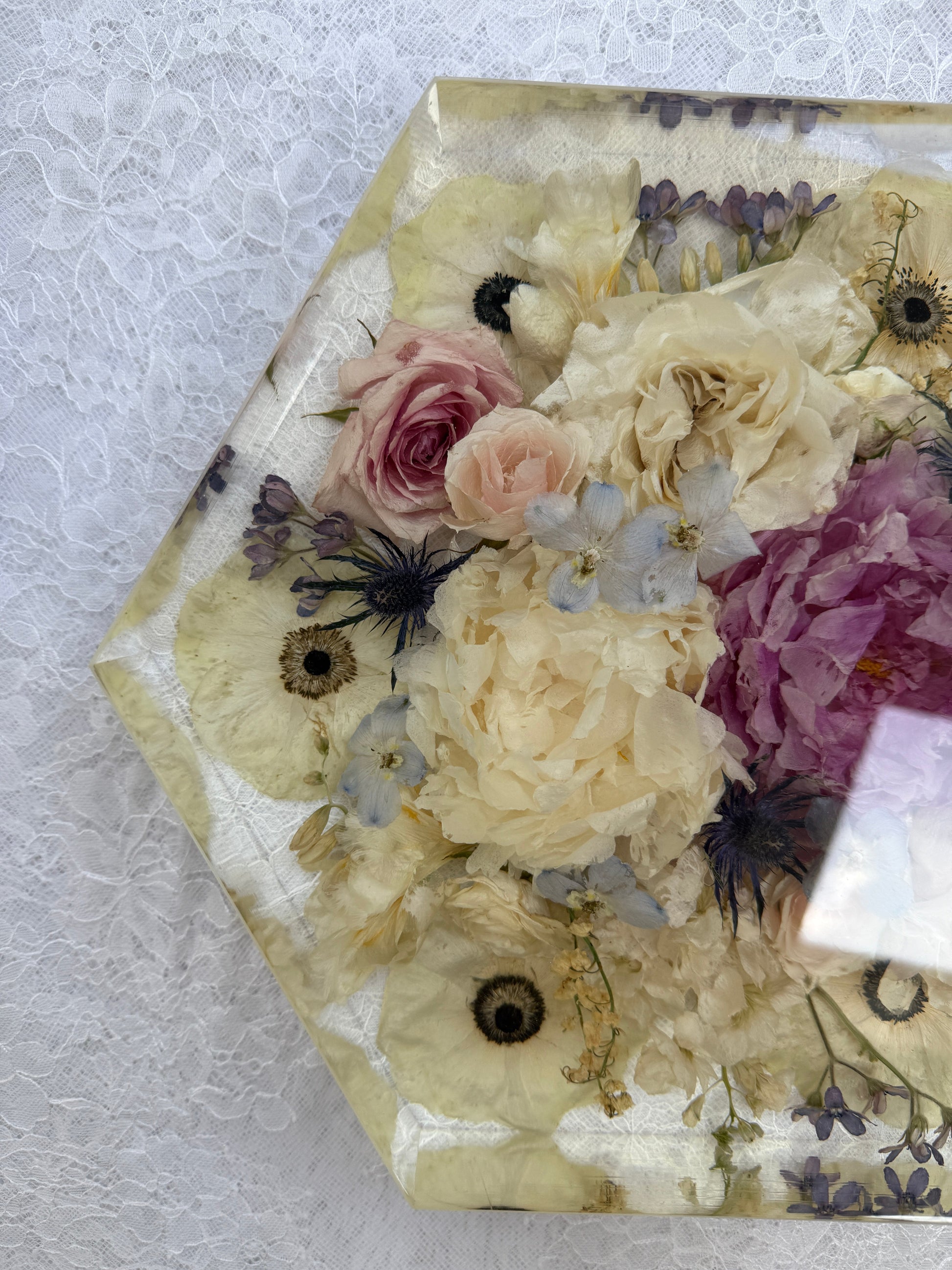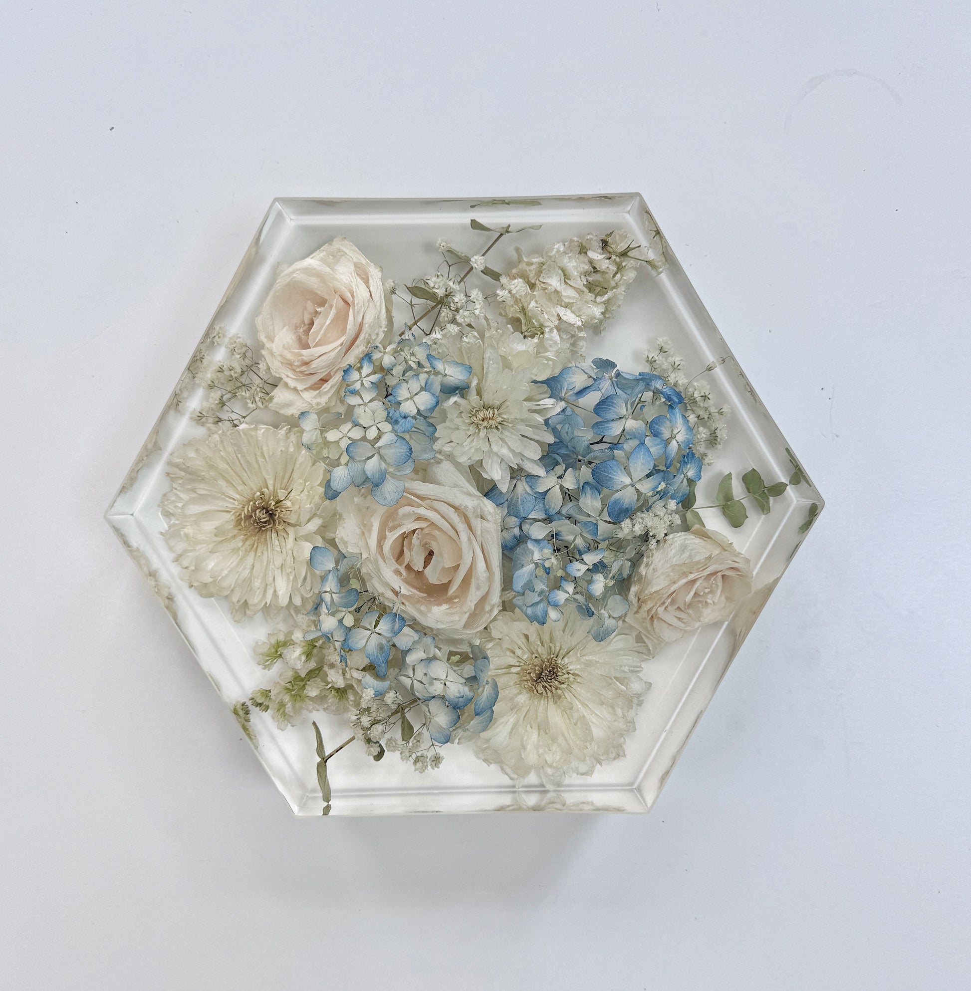 This hexagon display piece is a modern and elegant way to preserve your cherished flowers. showcasing them in a timeless geometric design.