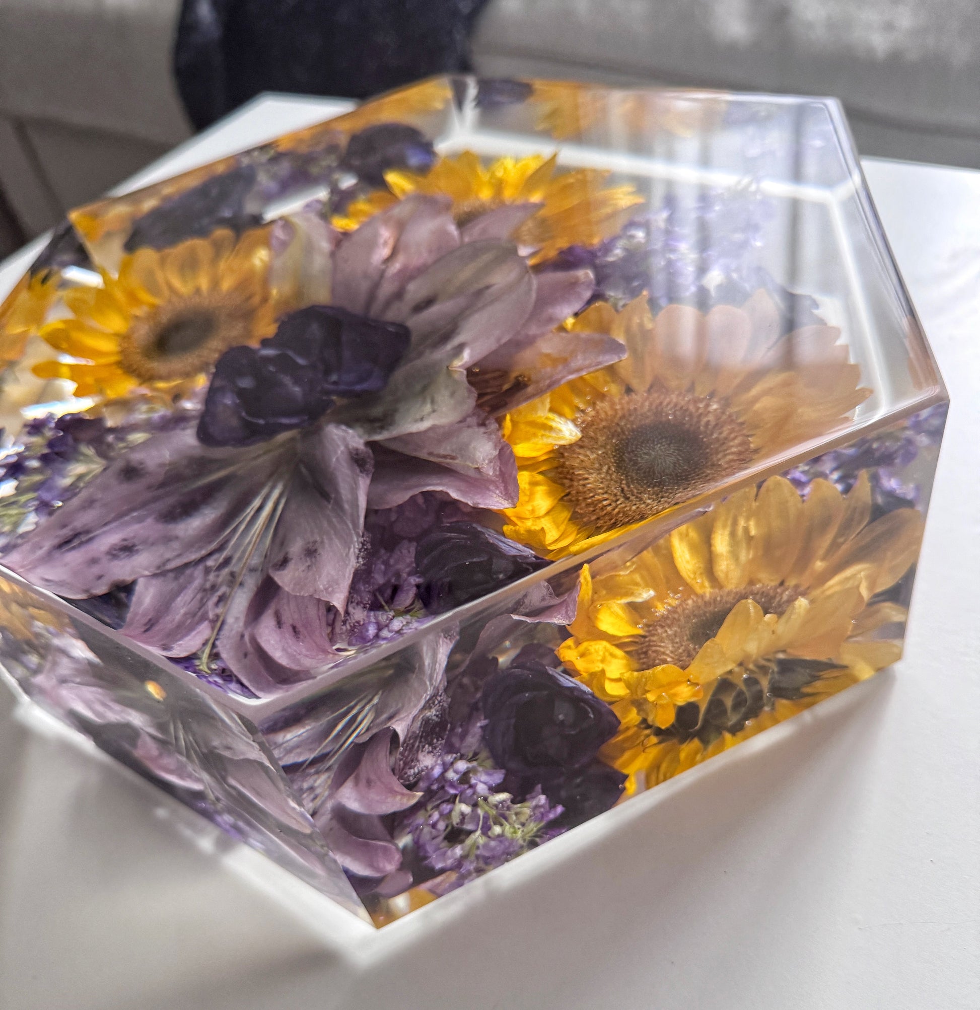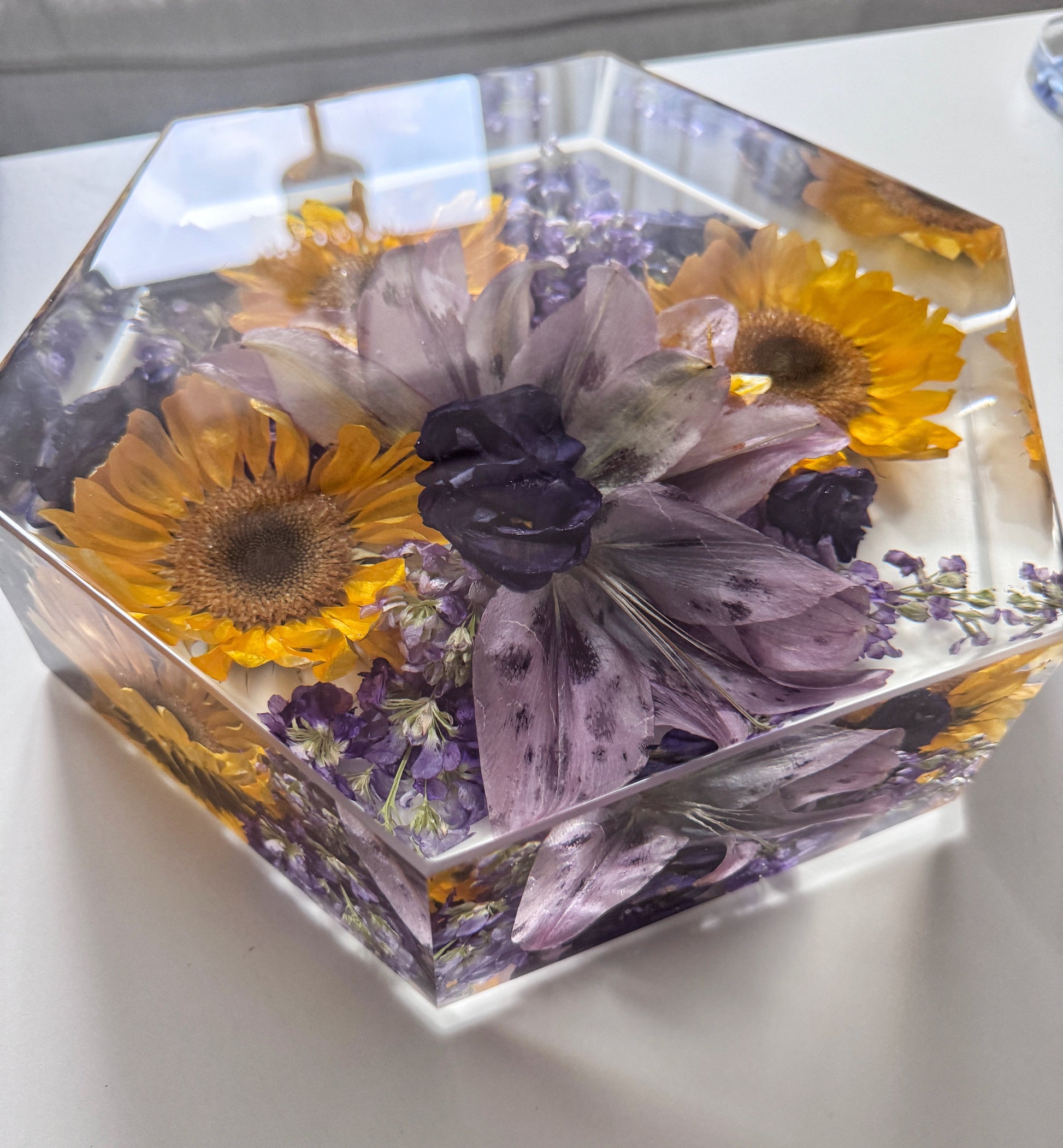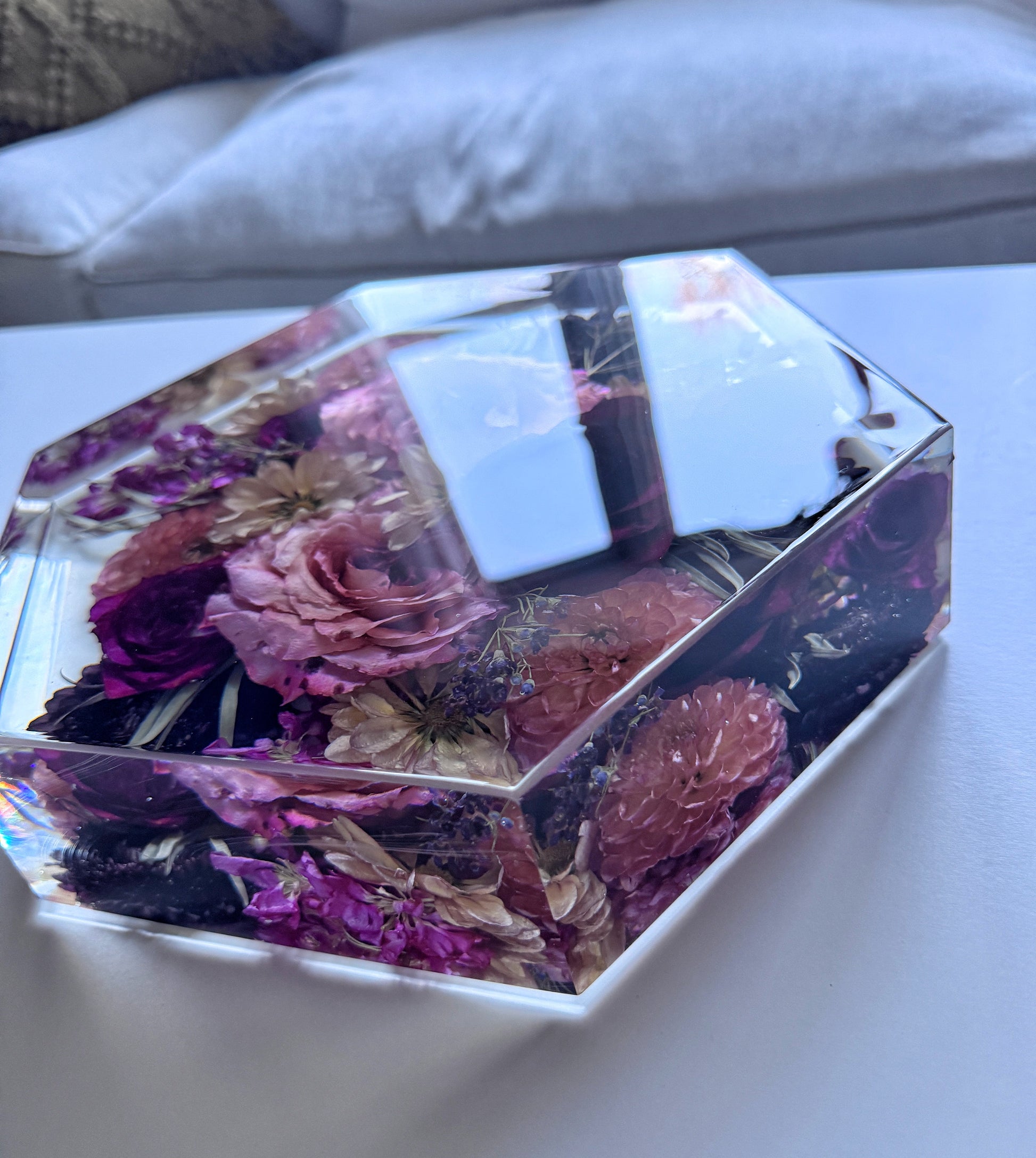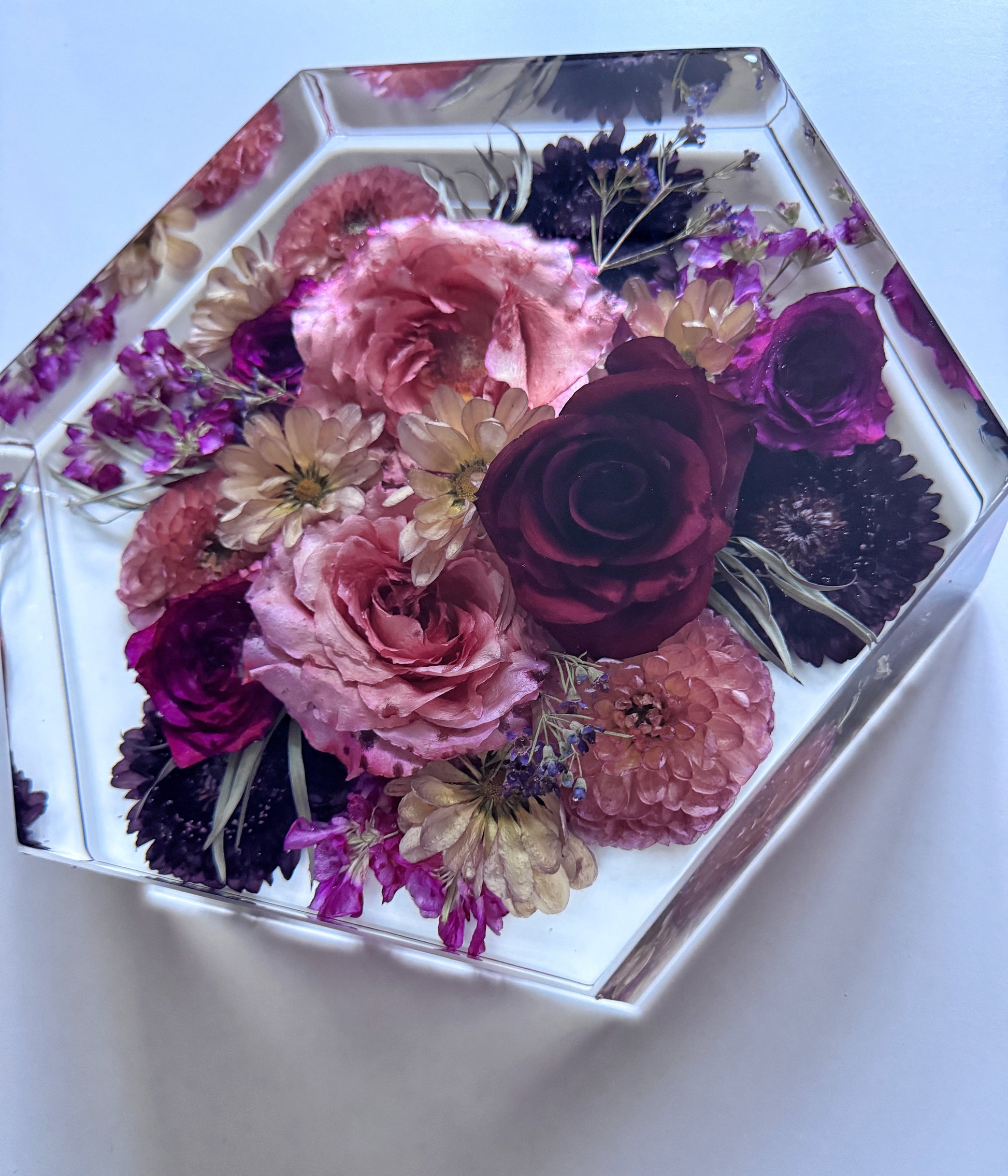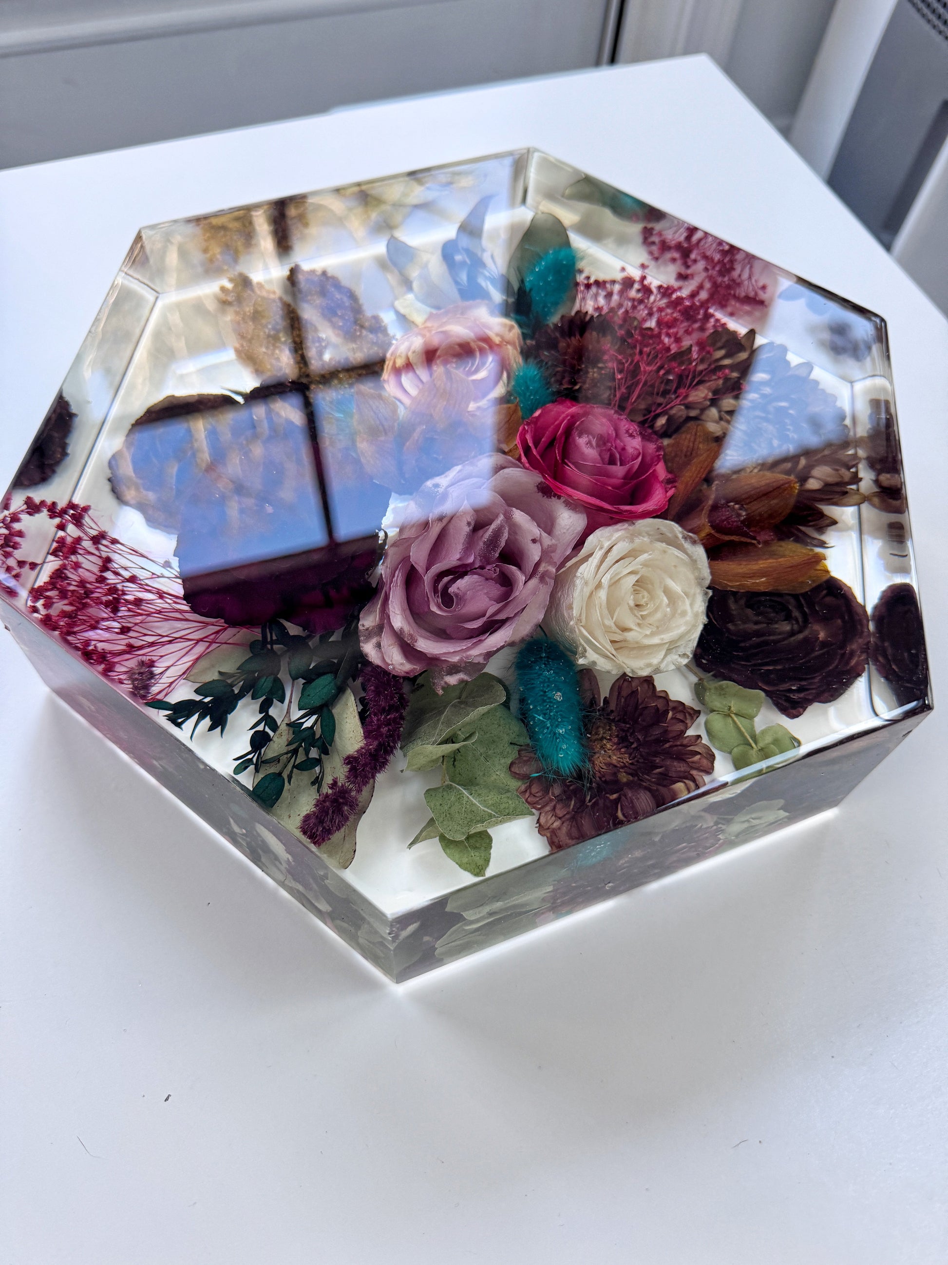 This hexagon display piece is a modern and elegant way to preserve your cherished flowers. showcasing them in a timeless geometric design.