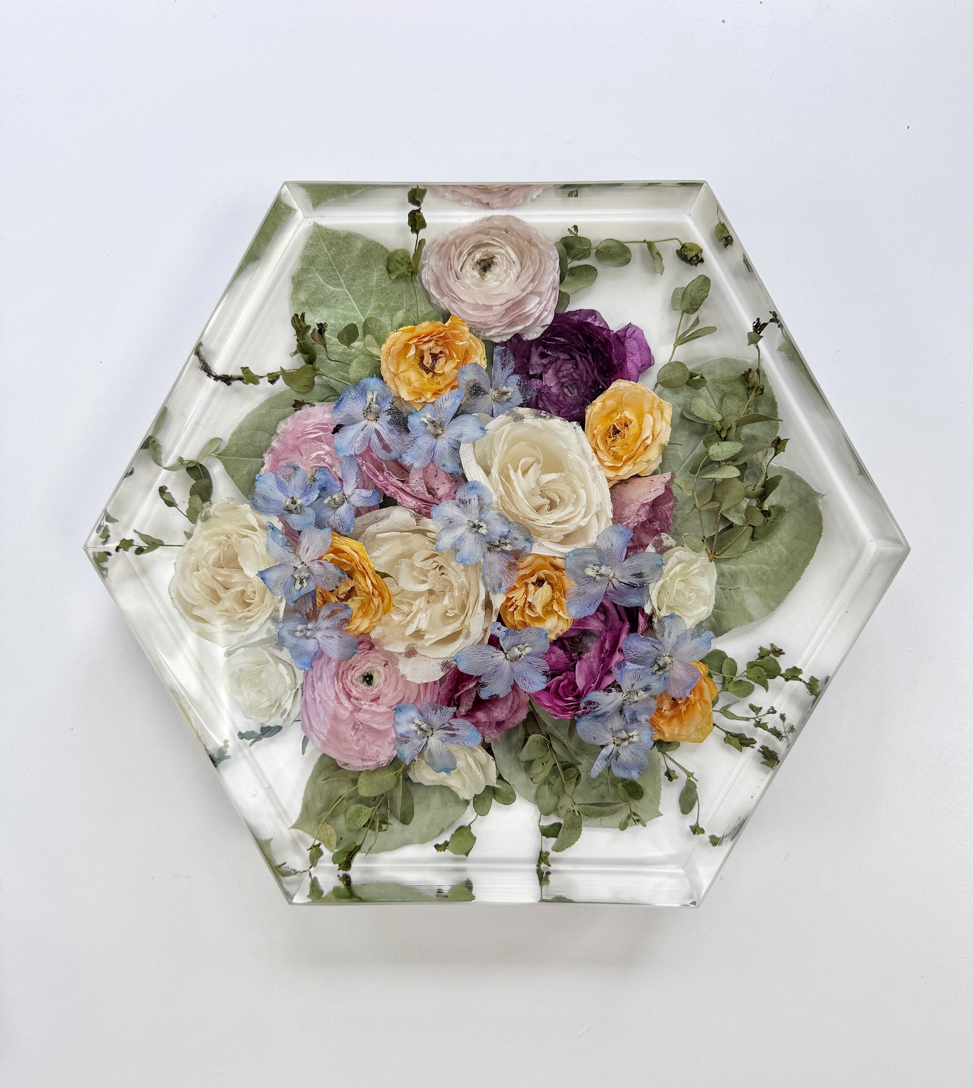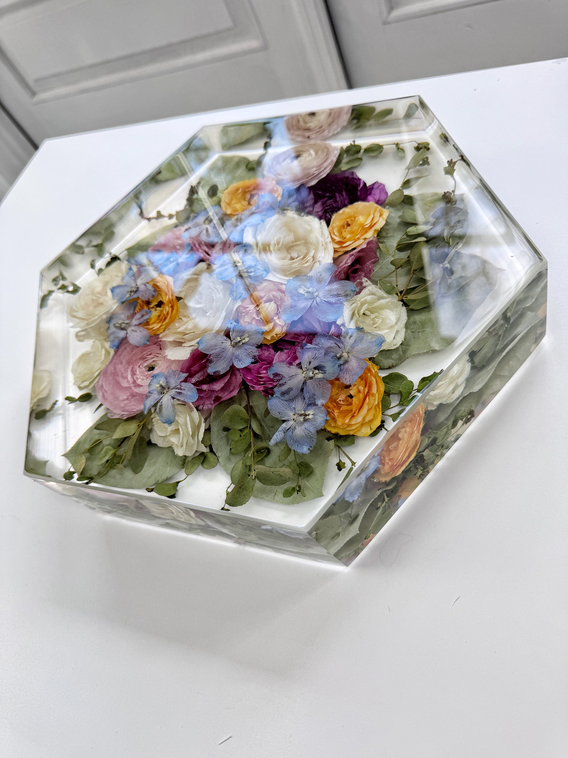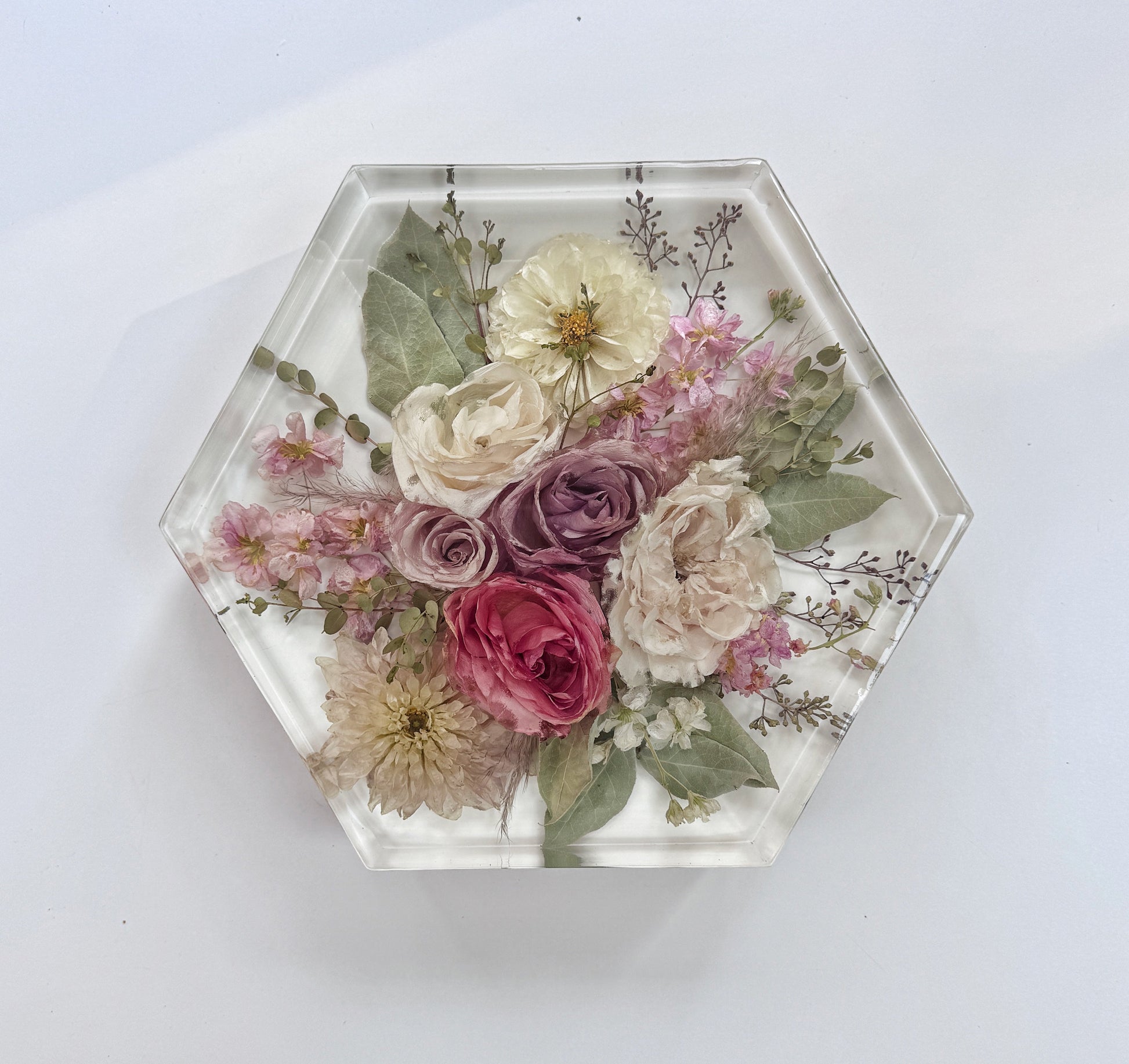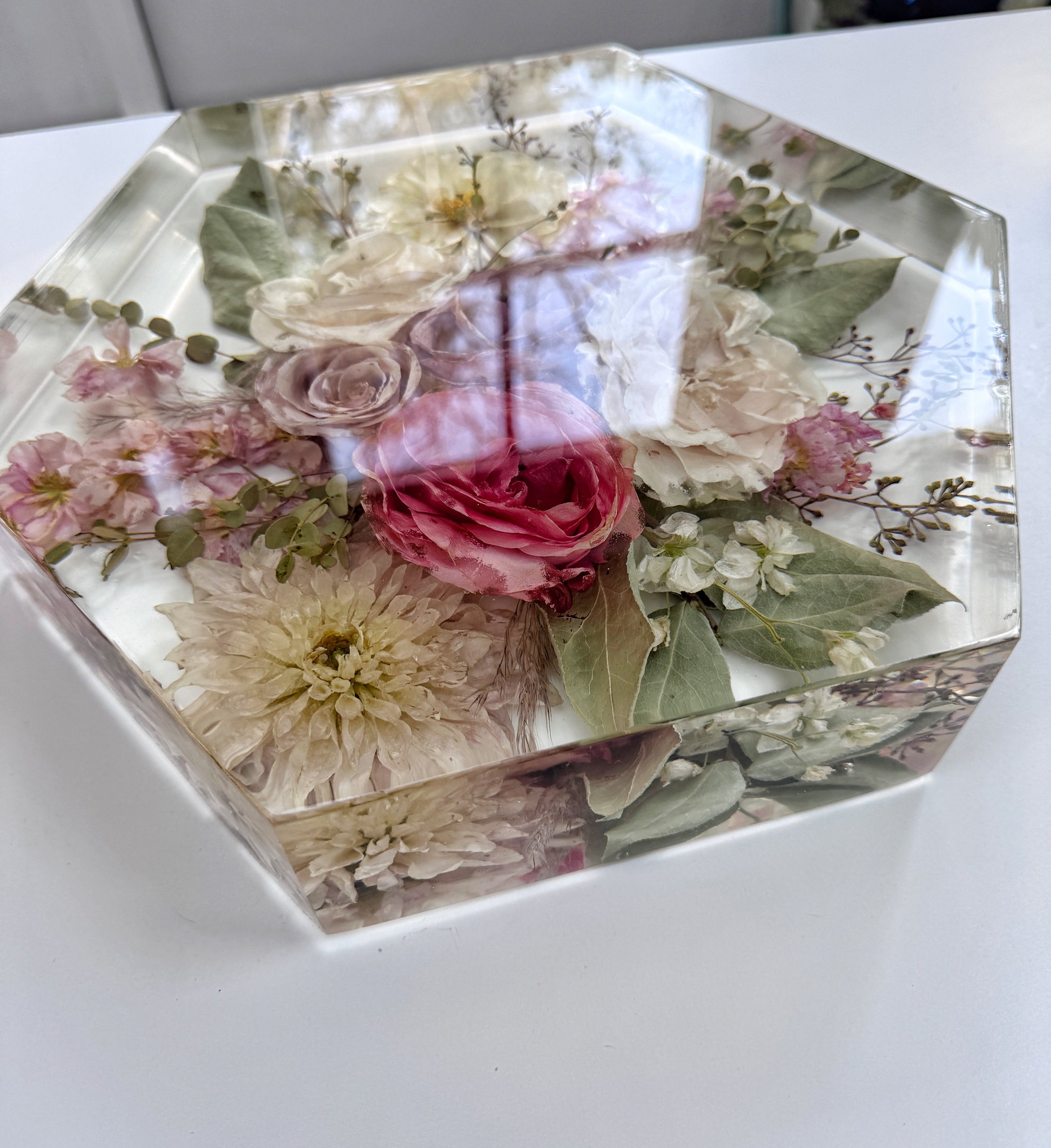This hexagon display piece is a modern and elegant way to preserve your cherished flowers. showcasing them in a timeless geometric design.