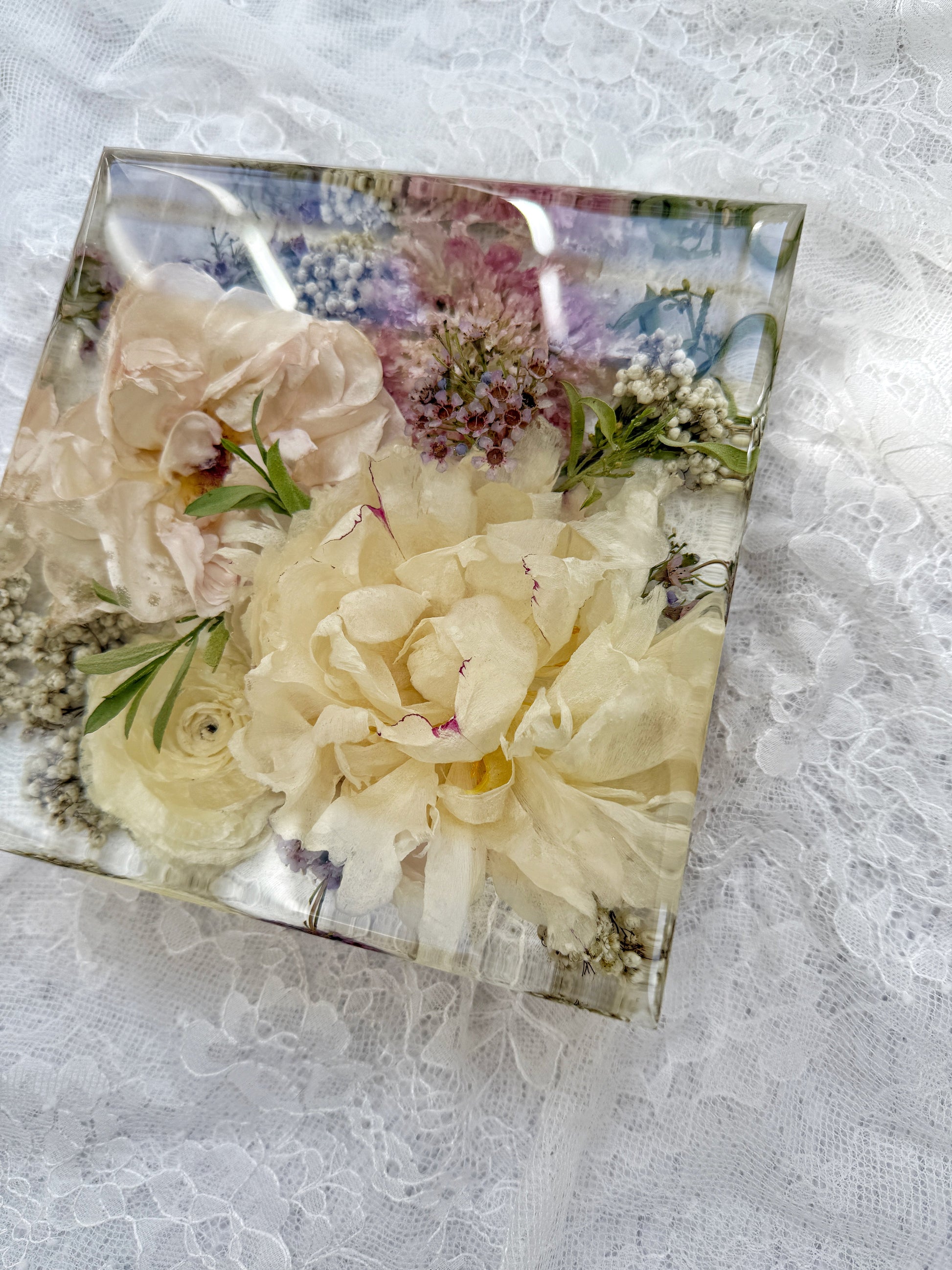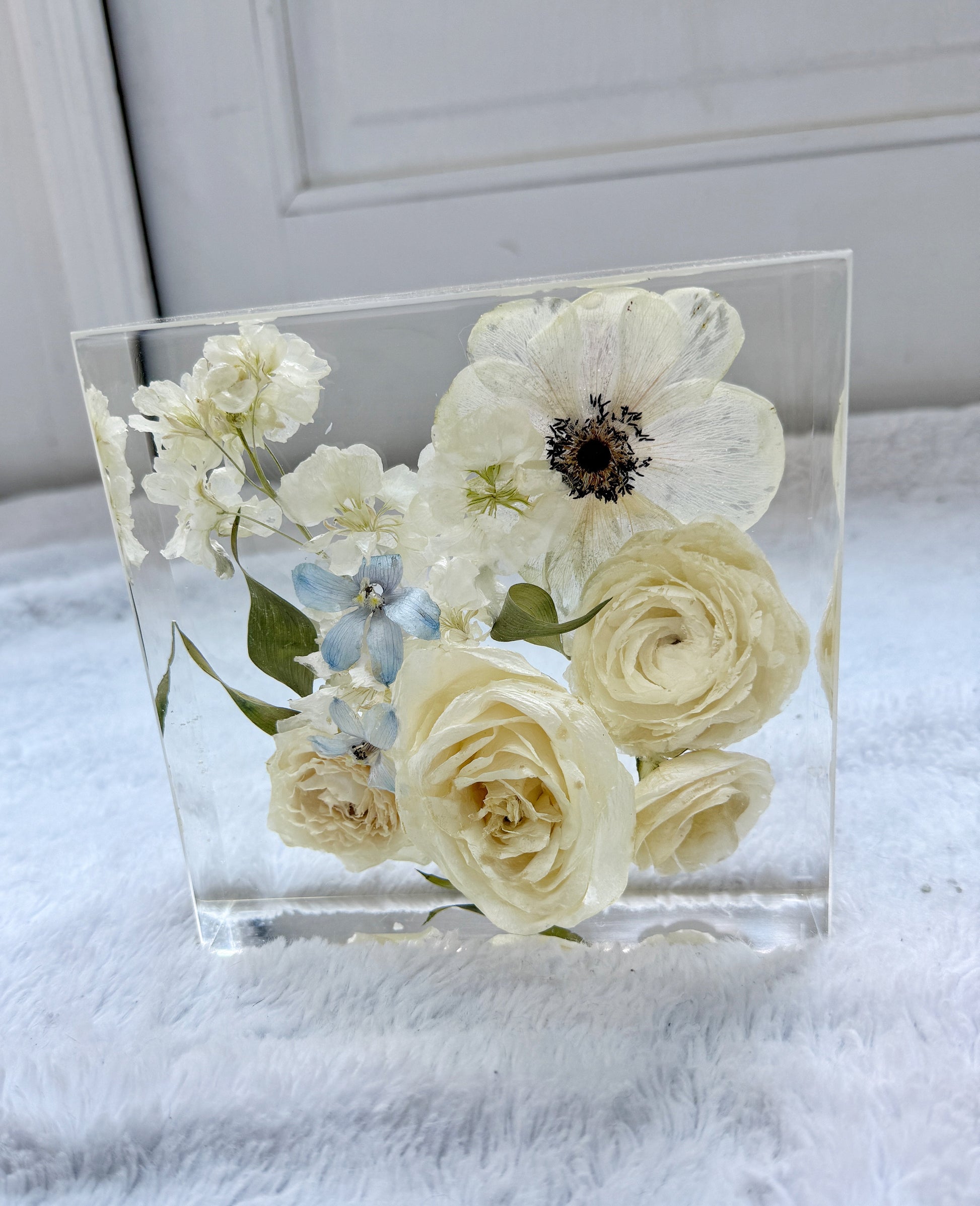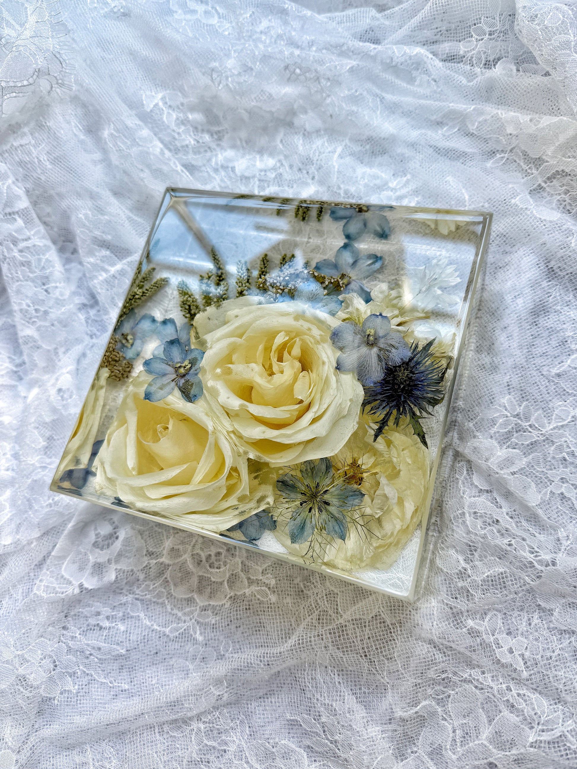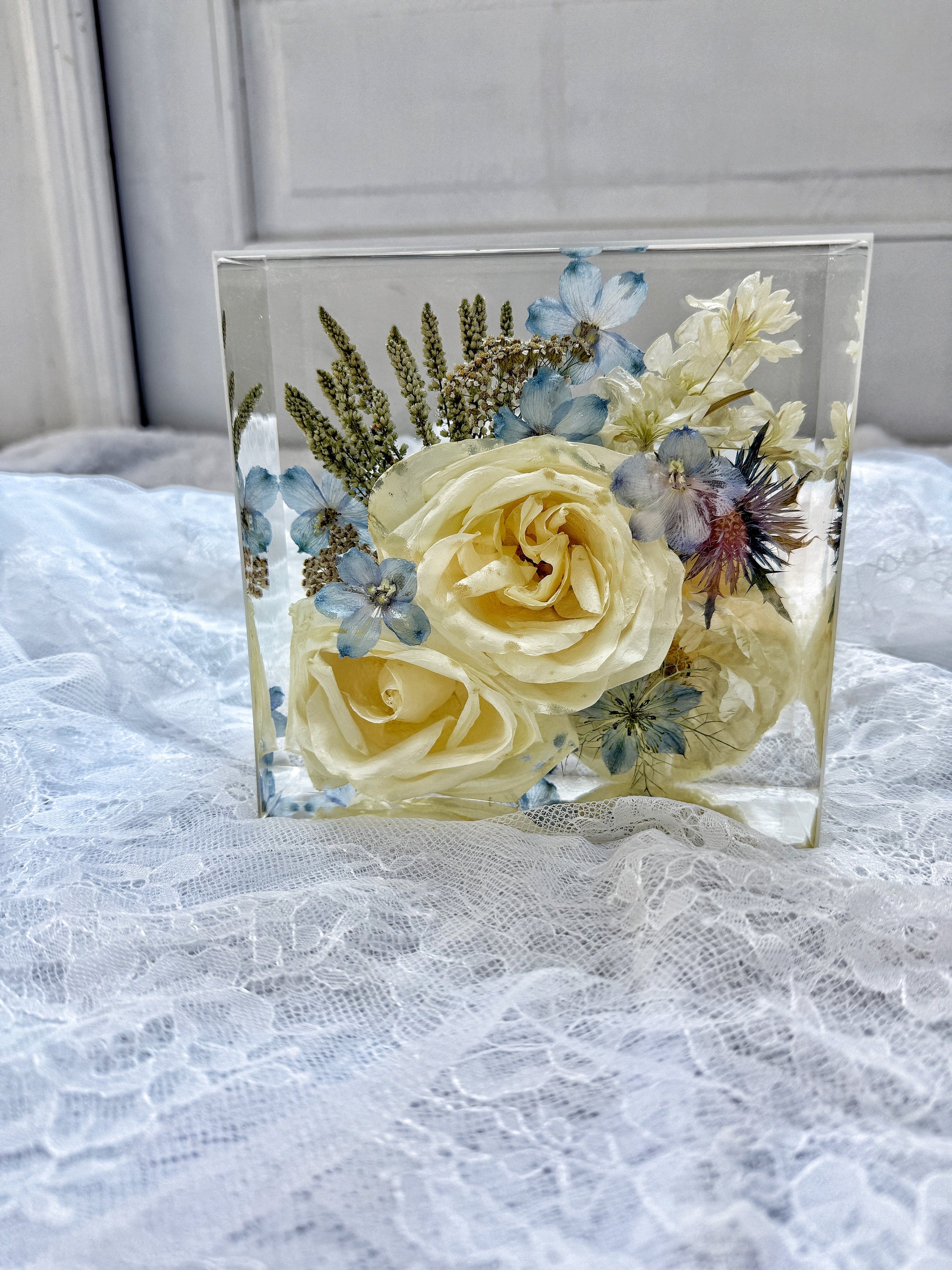 This square display piece beautifully preserves your flowers in a solid. elegant form. making it a timeless addition to your home décor.