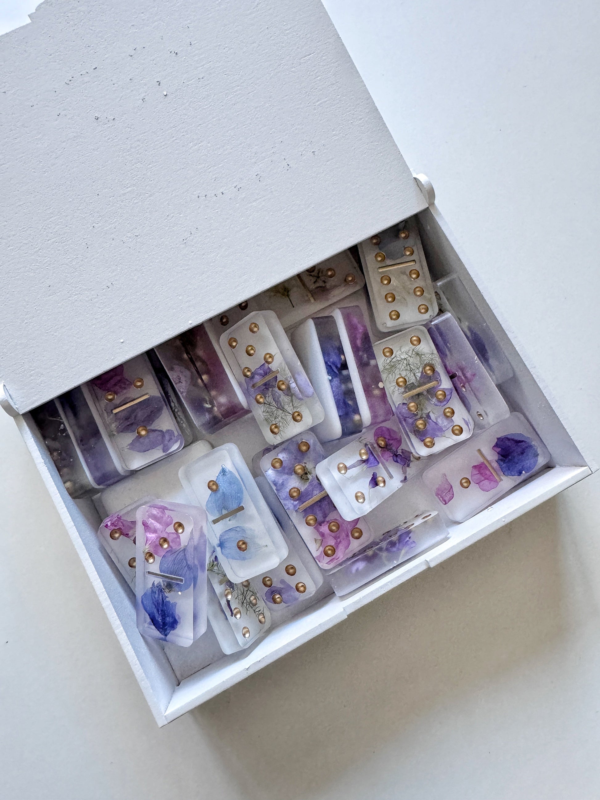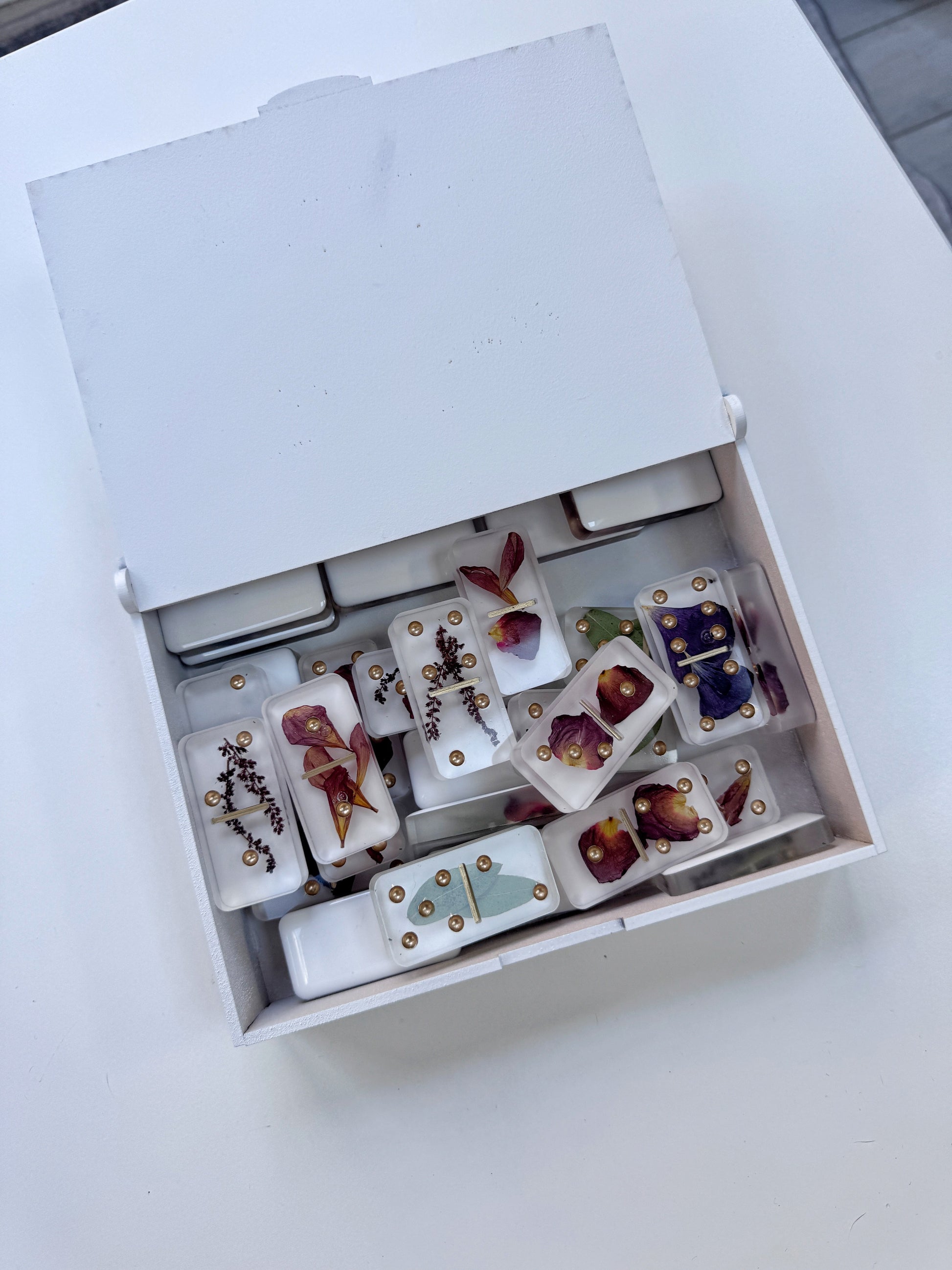 Elevate your game nights with these custom floral preservation dominoes. a beautiful blend of playfulness and elegance. Each set is handcrafted to showcase your preserved flowers. making it both a functional game set and a work of art.