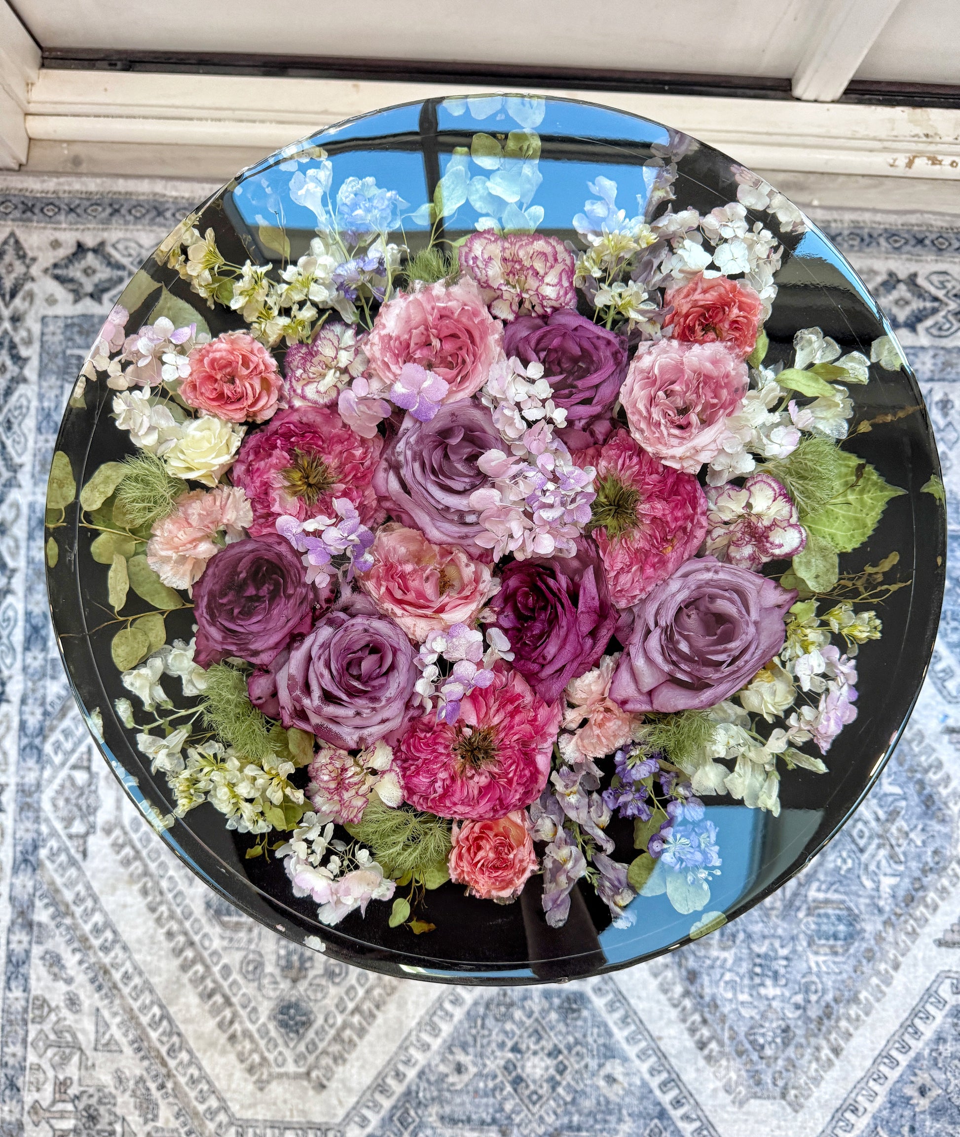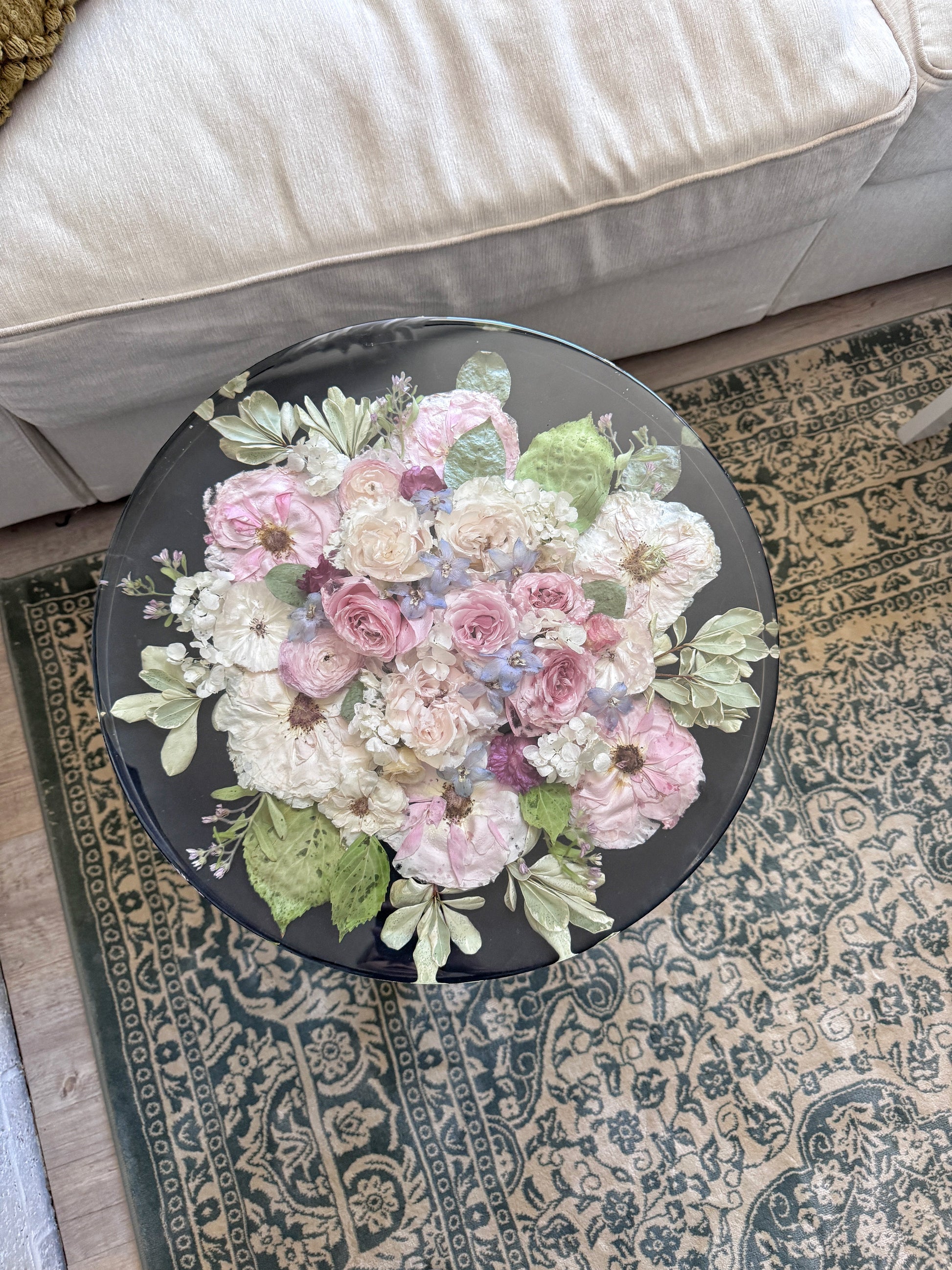 This stunning floral table preserves your cherished flowers in a bold. functional centerpiece for your home. Fully customizable. it blends beauty and practicality. making it a unique and lasting keepsake.