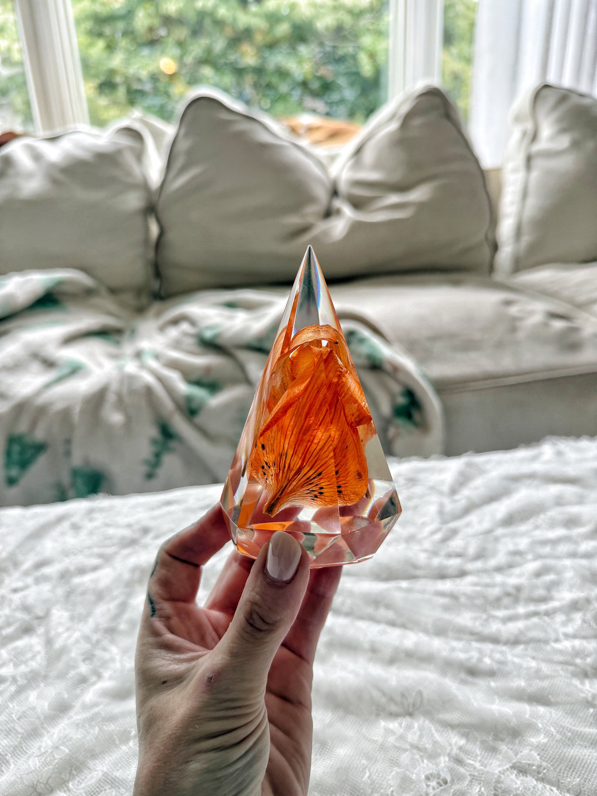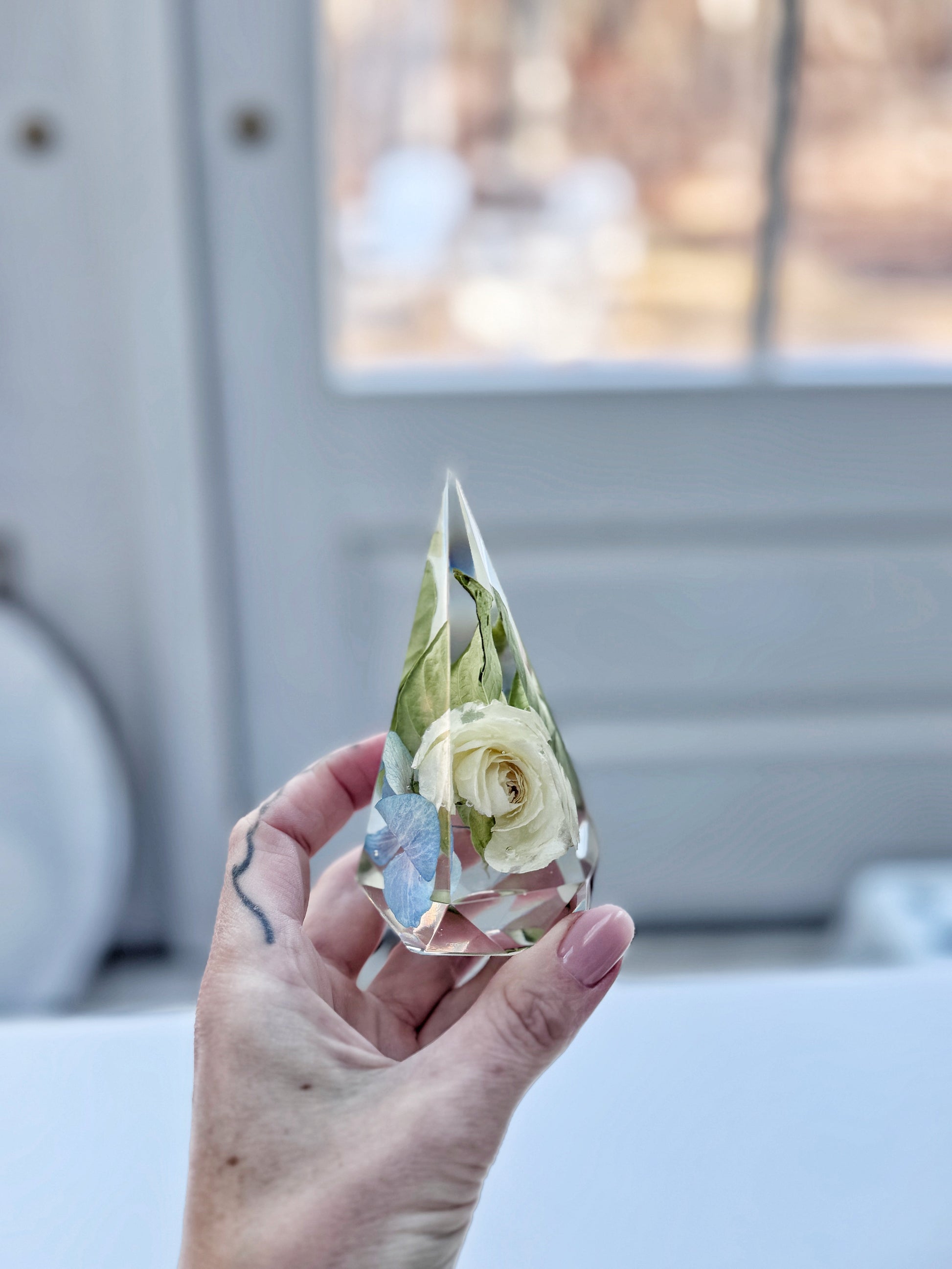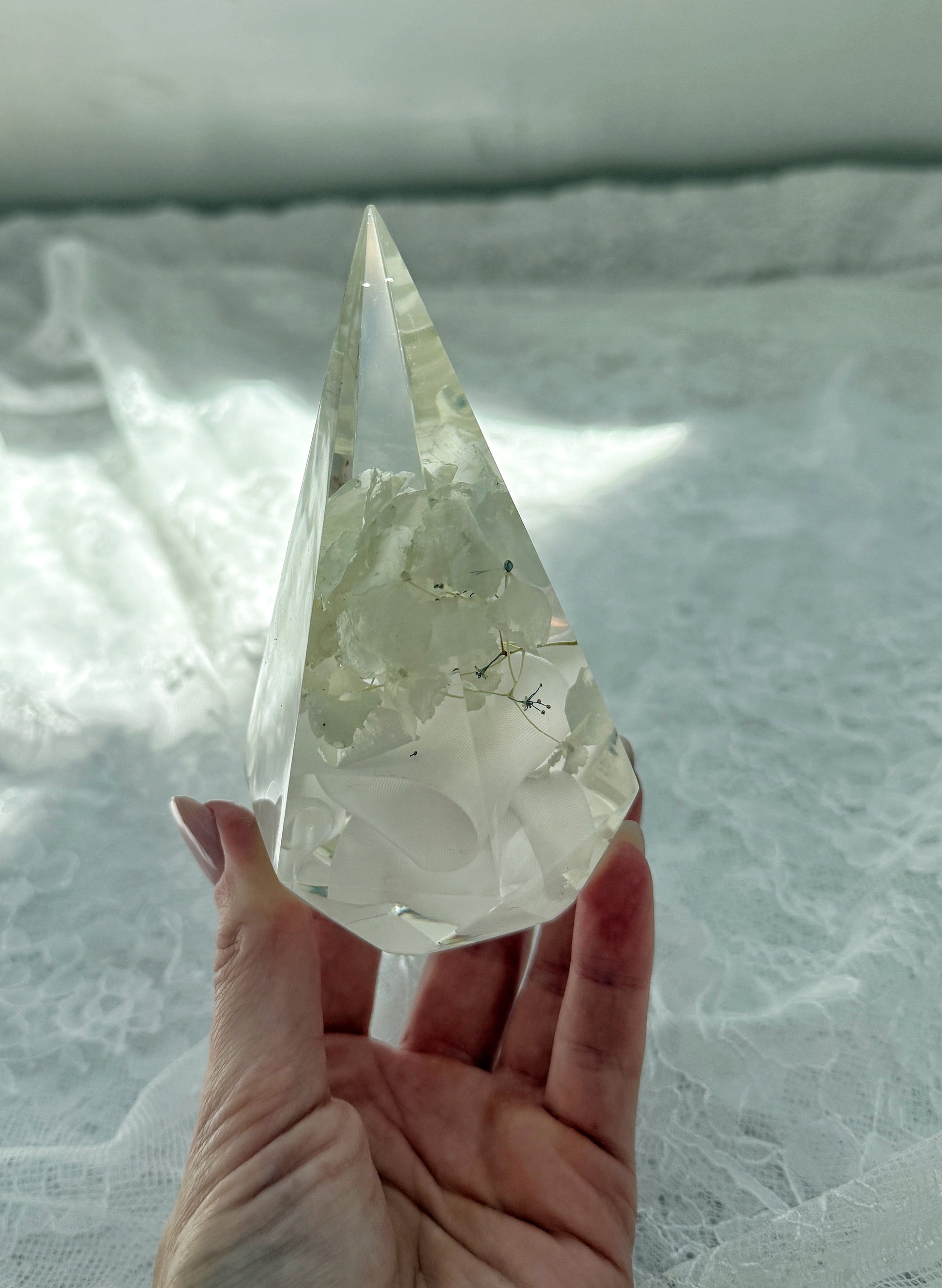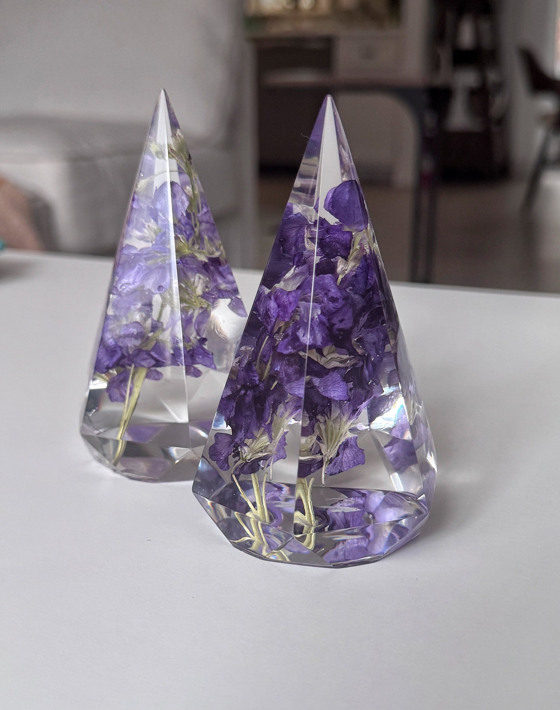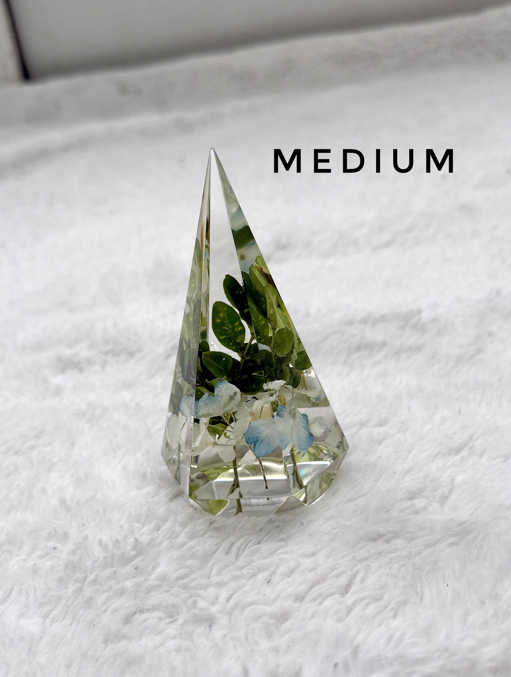 Preserve your cherished flowers with these elegant ring holders. designed to be both functional and decorative. Available in faceted pyramid or teardrop shapes. these pieces beautifully display your florals while offering a practical way to store your rings.