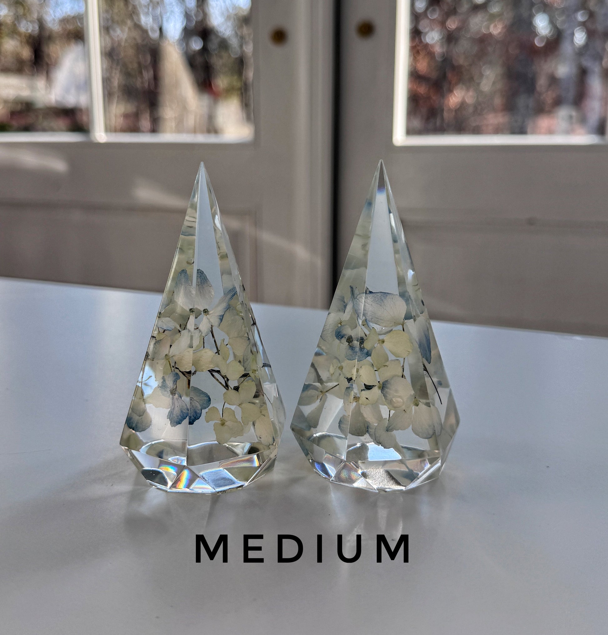 • Unique Designs: Choose from medium or large faceted pyramids or a graceful teardrop shape.